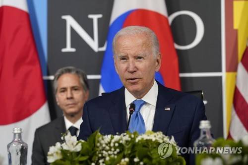 President Joe Biden, with Secretary of State Antony Blinken behind him at left, speaks during a meeting with South Korea's President Yoon Suk Yeol and Japan's Prime Minister Fumio Kishida during the NATO summit in Madrid, Wednesday, June 29, 2022. (AP Photo/Susan Walsh)