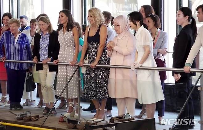 [마드리드=뉴시스] 윤석열 대통령 부인 김건희 여사가 29일(현지시간) 마드리드에서 나토 정상회의 배우자 프로그램 일환으로 정상 배우자들과 왕립유리공장을 둘러보고 있다. (사진=스페인 왕실 공식 유튜브 캡처) 2022.06.29. photo@newsis.com