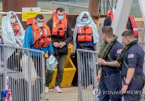 epa10041149 Border Force Officials control migrants that crossed the English Channel from France to Dover, Britain, 29 June 2022. Under a scheme designed to crack down on migrants landing on British shores after crossing the Channel in small boats, the UK intends to provide those deemed to have arrived unlawfully with a one-way ticket to Rwanda. It is estimated that more than 12,000 people have crossed the Channel in 2022 compared to 5,654 in 2021 by this date. EPA/STUART BROCK