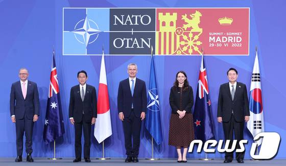 (마드리드=뉴스1) 오대일 기자 = 윤석열 대통령이 29일(현지시간) 스페인 마드리드 이페마(IFEMA) 컨벤션센터에서 열린 아시아 태평양 파트너 4개국 정상-옌스 스톨텐베르그 나토(NATO·북대서양조약기구) 사무총장과의 기념촬영에 참석하고 있다. 왼쪽부터 앤서니 노먼 알바니지 호주 총리, 기시다 후미오 일본 총리, 옌스 스톨텐베르그 나토 사무총장, 저신다 케이트 로렐 아던 뉴질랜드 총리, 윤 대통령. 윤 대통령은 기시다 후미오 일본 총리, 앤서니 앨버니지 호주 총리, 저신다 아던 뉴질랜드 총리와 함께 아시아 태평양 파트너 4개국 자격으로 초청됐다. (대통령실사진기자단) 2022.6.29/뉴스1