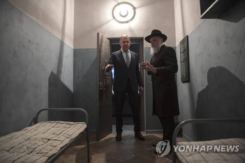 epa10041163 A handout photo made available by the Russian Foreign Ministry's press service shows Russian Foreign Minister Sergey Lavrov (L) visiting an exhibiton with the president of the Federation of Jewish Communities of Russia Alexander Boroda (R) during their visit to the Jewish Museum and Tolerance Centre in Moscow, Russia, 29 June 2022. EPA/ALEXEI NIKOLSKY/RUSSIAN FOREIGN MINISTRY HANDOUT HANDOUT EDITORIAL USE ONLY/NO SALES
