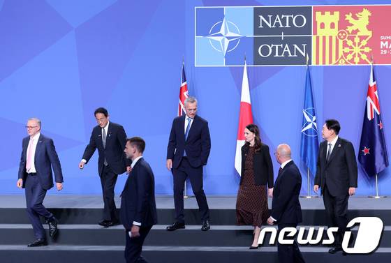 (마드리드=뉴스1) 오대일 기자 = 윤석열 대통령이 29일 오후(현지시간) 스페인 마드리드 이페마(IFEMA) 컨벤션센터에서 아시아 태평양 파트너 4개국 정상-옌스 스톨텐베르그 나토(NATO·북대서양조약기구) 사무총장과 기념촬영을 마친 후 이동하고 있다. 윤 대통령은 기시다 총리, 앤서니 앨버니지 호주 총리, 저신다 아던 뉴질랜드 총리와 함께 아시아 태평양 파트너 4개국 자격으로 나토 정상회의에 초청받았다. (대통령실사진기자단) 2022.6.29/뉴스1