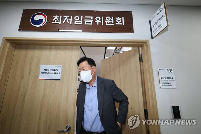 (세종=연합뉴스) 김주형 기자 = 공익위원이 내년도 최저임금 9,620원을 제시한 가운데 29일 오후 세종시 정부세종청사 최저임금위원회 회의실에서 류기정 한국경영자총협회 전무와 사용자위원들이 표결을 거부한 뒤 퇴장하고 있다. 2022.6.29