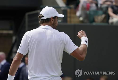 Steve Johnson of the US celebrates defeating Britain's Ryan Peniston in a second round men's singles match on day three of the Wimbledon tennis championships in London, Wednesday June 29, 2022. (AP Photo/Alberto Pezzali)
