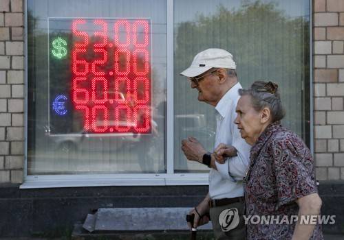 epa10041130 Elderly people walk past a currency exchange office with a screen displaying the exchange rates of Euro and US Dollar to Russian Rubles in Moscow, Russia, 29 June 2022. The Russian ruble continues to strengthen against other currencies and has reached 52,97 for the US Dollar and 55,89 for the Euro. For the first time since April 2015, the exchange rate of the Euro dropped below 53 rubles during trading on the Moscow Exchange. EPA/YURI KOCHETKOV