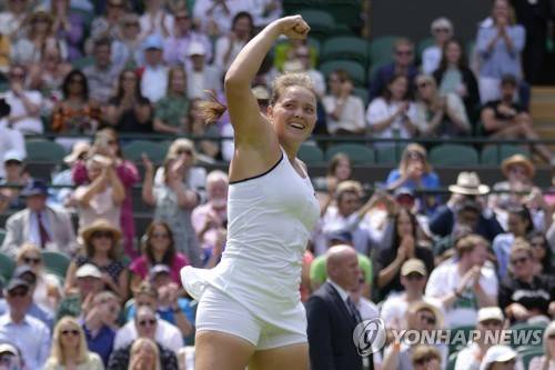 Germany's Jule Niemeier celebrates defeating Estonia's Anett Kontaveit during their singles tennis match on day three of the Wimbledon tennis championships in London, Wednesday, June 29, 2022. (AP Photo/Kirsty Wigglesworth)