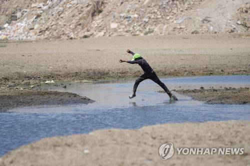 A young man jumps as he crosses the Diyala River, a tributary of the Tigris, where decreasing water levels this year have raised alarm among residents, near Baghdad, Iraq, Wednesday, June 29, 2022. (AP Photo/Hadi Mizban) the Diyala River by jumping, river is significantly lower water levels are seen, in Baghdad, Iraq, Wednesday, June 29, 2022. (AP Photo/Hadi Mizban)