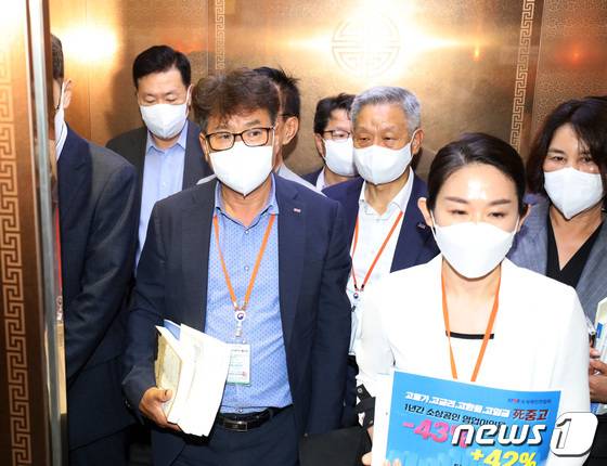 (세종=뉴스1) 김기남 기자 = 29일 오후 정부세종청사에서 열린 최저임금위원회 제8차 전원회의 중 사용자위원들이 공익위원이 내년도 최저임금을 9천410∼9천860원을 제시한것에 반발하며 회의장을 떠나고 있다. 2022.6.29/뉴스1