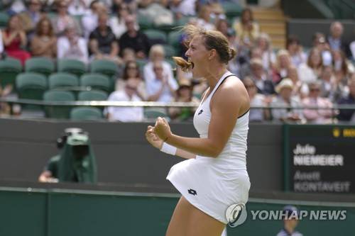 Germany's Jule Niemeier celebrates defeating Estonia's Anett Kontaveit during their singles tennis match on day three of the Wimbledon tennis championships in London, Wednesday, June 29, 2022. (AP Photo/Kirsty Wigglesworth)