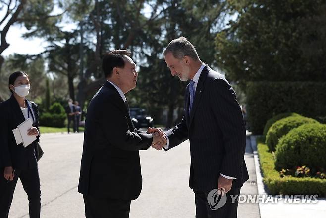 (마드리드=연합뉴스) 서명곤 기자 = 북대서양조약기구(NATO·나토) 정상회의 참석을 위해 스페인을 방문 중인 윤석열 대통령이 29일(현지시간) 마드리드 사르수엘라궁에서 펠리페 6세 스페인 국왕과 악수하고 있다. 2022.6.29
