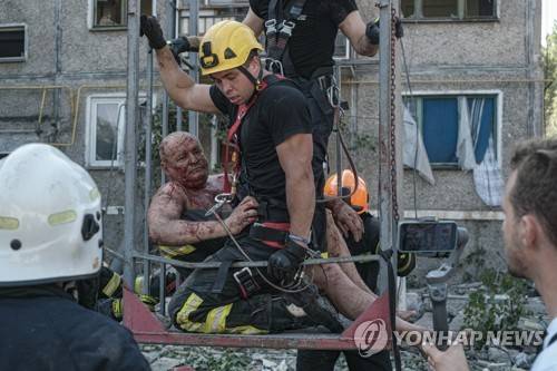 epaselect epa10041159 Ukrainian rescue workers evacuate a wounded person after shelling at a residential area in Mykolaiv, southern Ukraine, 29 June 2022. The Head of the Mykolaiv Regional Military Administration, Vitaliy Kim, reported that as a result of shelling hitting a high-rise apartment building in Mykolaiv on 29 June 2022, at least three people died and five others were injured. Russian troops on 24 February entered Ukrainian territory, starting a conflict that has provoked destruction and a humanitarian crisis. EPA/GEORGE IVANCHENKO -- ATTENTION EDITORS: GRAPHIC CONTENT