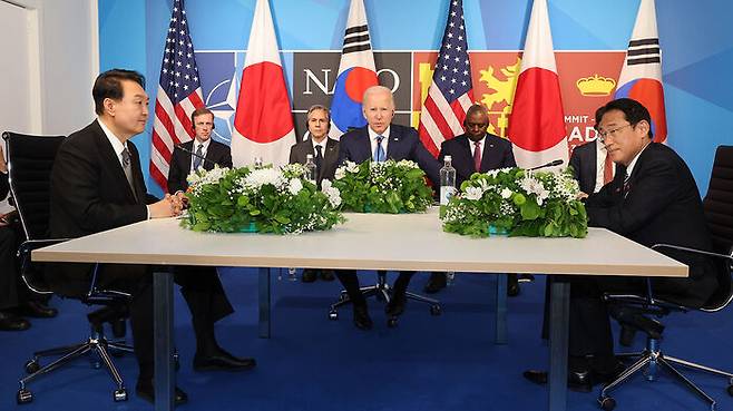 마이크를 넘겨받은 윤 대통령은 "나토 정상회의를 계기로 한미일 정상이 한자리에 모인 것을 뜻깊게 생각한다"며 "회의를 주재해준 바이든 대통령께 감사를 표하고, 기시다 총리를 이렇게 또 뵙게 돼 반갑다"고 말문을 열었습니다.