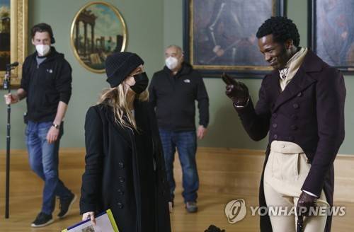 This image released by Bleecker Street shows Ṣọpẹ́ Dìrísù, right, and director Emma Holly Jones on the set of "Mr. Malcolm's List." (Ross Ferguson/Bleecker Street via AP) AP PROVIDES ACCESS TO THIS THIRD PARTY PHOTO SOLELY TO ILLUSTRATE NEWS REPORTING OR COMMENTARY ON FACTS DEPICTED IN IMAGE; MUST BE USED WITHIN 14 DAYS FROM TRANSMISSION; NO ARCHIVING; NO LICENSING; MANDATORY CREDIT