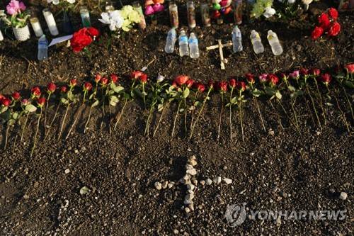 A makeshift memorial at the site where officials found dozens of people dead in an abandoned semitrailer containing suspected migrants include flowers, water bottles and candles, Wednesday, June 29, 2022, in San Antonio. (AP Photo/Eric Gay)