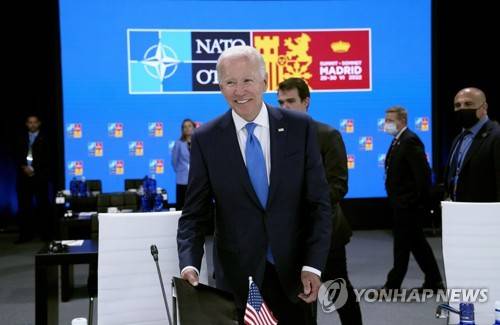 U.S. President Joe Biden arrives for a round table meeting at a NATO summit in Madrid, Spain on Wednesday, June 29, 2022. North Atlantic Treaty Organization heads of state will meet for a NATO summit in Madrid from Tuesday through Thursday. (AP Photo/Bernat Armangue)