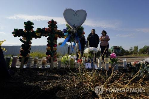 Mourners pay their respects at a makeshift memorial at the site where officials found dozens of people dead in an abandoned semitrailer containing suspected migrants, Wednesday, June 29, 2022, in San Antonio. (AP Photo/Eric Gay)