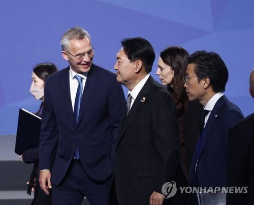 epa10041216 NATO Secretary-General, Jens Stoltenberg (L) chats with Japan's Prime Minister Fumio Kishida (C) after a press conference on the first day of the NATO Summit at IFEMA Convention Center, in Madrid, Spain, 29 June 2022. Heads of State and Government of NATO's member countries and key partners are gathering in Madrid from 29 to 30 June to discuss security concerns like Russia's invasion of Ukraine and other challenges. Spain is hosting 2022 NATO Summit coinciding with the 40th anniversary of its accession to NATO. EPA/Rodrigo Jimenez