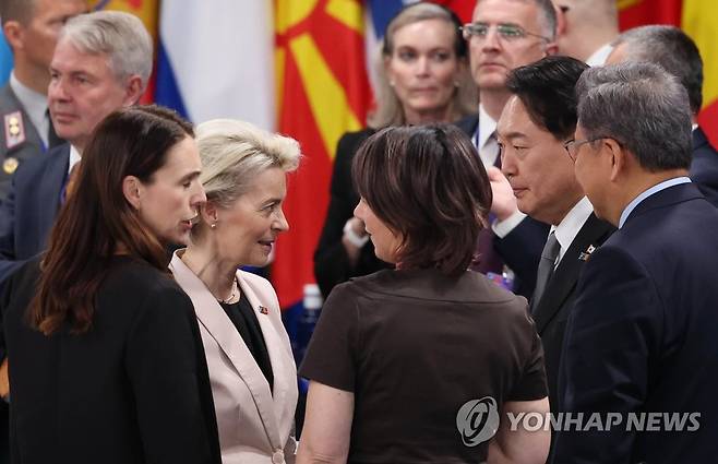 (마드리드=연합뉴스) 서명곤 기자 = 윤석열 대통령과 우르줄라 폰데어라이엔 EU 집행위원장이 29일 스페인 마드리드 이페마(IFEMA) 컨벤션센터에서 열린 북대서양조약기구(NATO·나토) 동맹국·파트너국 정상회의에서 대화하고 있다. 2022.6.29