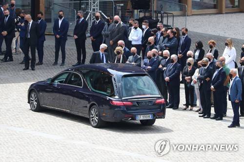 epa10041192 Relatives and friends of the founder and chairman of eyeglasses manufacturer Luxottica, Leonardo Del Vecchio, attend his funeral at the funeral home set up inside the Palaluxottica, a structure located a short distance from the main factory, in Agordo, near Belluno, Italy, 29 June 2022. Leonardo Del Vecchio died on 27 June 2022 at the age of 87. EPA/Andrea Solero
