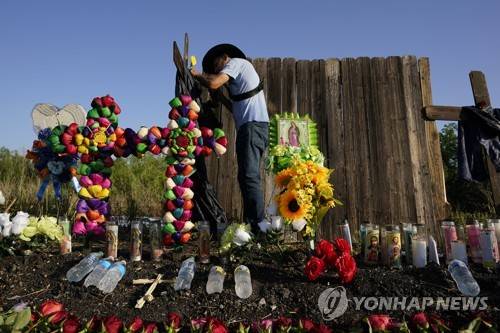 of Dallas adds a flower to a makeshift memorial at the site where officials found dozens of people dead in an abandoned semitrailer containing suspected migrants, Wednesday, June 29, 2022, in San Antonio. (AP Photo/Eric Gay)