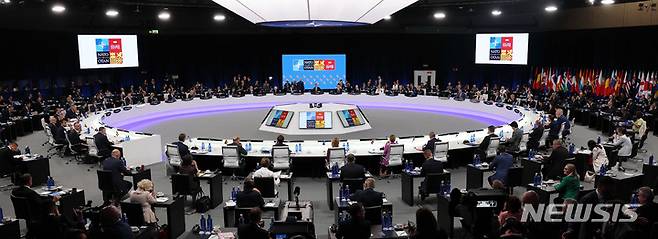 [마드리드=뉴시스] 전신 기자 = 윤석열 대통령이 29일(현지시간) 마드리드 이페마(IFEMA)에서 열린 나토 동맹국-파트너국 정상회의에 참석해 있다. 2022.06.29. photo1006@newsis.com