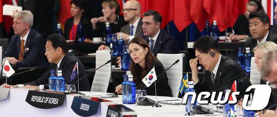 (마드리드=뉴스1) 오대일 기자 = 윤석열 대통령이 29일(현지시간) 스페인 마드리드 이페마 국제회의장에서 열린 NATO 동맹국·파트너국 정상회의에 참석하고 있다. 왼쪽은 기시다 후미오 일본 총리. (대통령실사진기자단) 2022.6.29/뉴스1