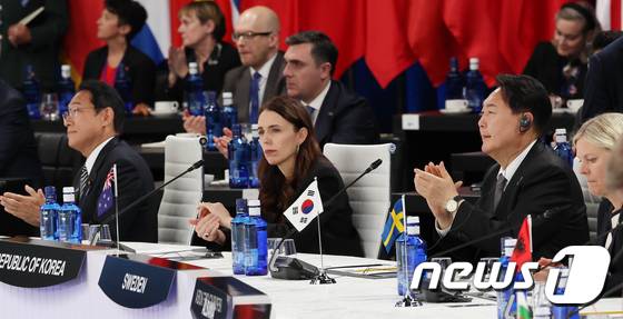 (마드리드=뉴스1) 오대일 기자 = 윤석열 대통령이 29일(현지시간) 스페인 마드리드 이페마(IFEMA) 국제회의장에서 열린 나토(NATO·북대서양조약기구) 동맹국·파트너국 정상회의에서 박수를 치고 있다. 왼쪽은 기시다 후미오 일본 총리. (대통령실사진기자단) 2022.6.29/뉴스1