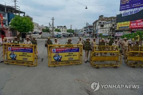 epa10041277 Security personal stand guard in the curfew bound area after the killing of tailor Kanhaiya Lal in Udaipur, India 29 June 2022. Rajasthan Police arrested Mohammed Riyaz Akhtar and Ghous Mohammed for the killing of Hindu tailor Kanhaiya Lal and having links with the Pakistan Islamist organization, a top Rajasthan police officer said, and Indian ministry of home affairs (MHA) directed the National Investigation Agency (NIA) to take over the further investigation. EPA/STR