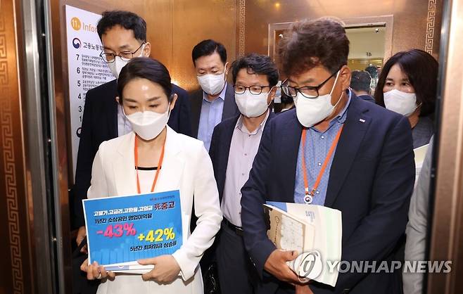 (세종=연합뉴스) 김주형 기자 = 공익위원이 내년도 최저임금 9,620원을 제시한 가운데 29일 오후 세종시 정부세종청사 최저임금위원회 회의실에서 표결을 거부하고 퇴장한 류기정 한국경영자총협회 전무를 비롯한 사용자 위원들이 승강기에 오르고 있다. 2022.6.29