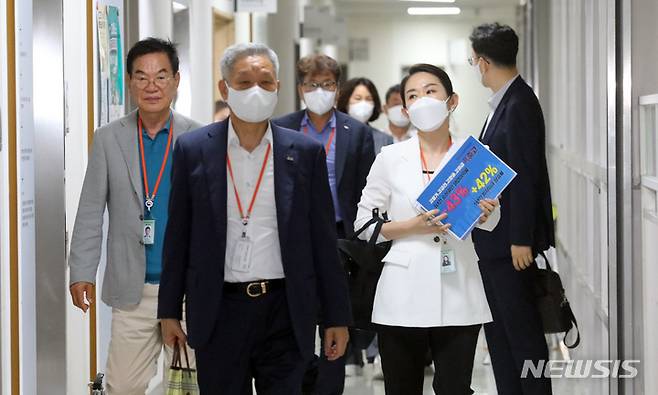 [세종=뉴시스] 강종민 기자 = 내년도 최저임금 결정을 놓고 노사 위원들의 막판 줄다리기가 이어진 29일 밤 사용자 위원들이 공익위원들이 제시한 최저임금 단일안(9620원)을 받아 들일 수 없다며 퇴장하고 있다. 2022.06.29. ppkjm@newsis.com