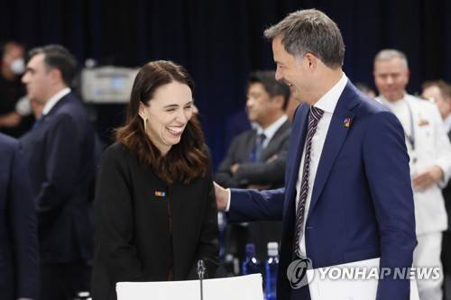 epa10041289 New Zealand's Prime Minister Jacinda Ardern (L) chats with Belgium's Prime Minister Alexander De Croo (R) ahead of a meeting during the first day of the NATO Summit at IFEMA Convention Center, in Madrid, Spain, 29 June 2022. Heads of State and Government of NATO's member countries and key partners are gathering in Madrid from 29 to 30 June to discuss security concerns like Russia's invasion of Ukraine and other challenges. Spain is hosting 2022 NATO Summit coinciding with the 40th anniversary of its accession to NATO. EPA/Lavandeira Jr