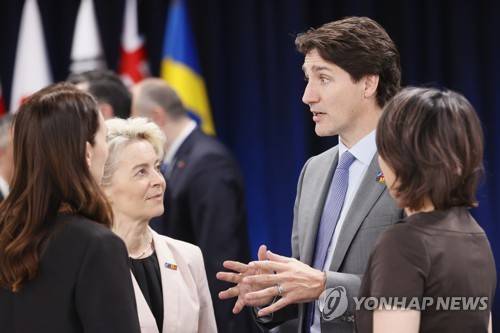epa10041298 Canada's Prime Minister Justin Trudeau (2-R) chats with EU Commission's President, Ursula von der Leyen (2-L) ahead of a meeting during the first day of the NATO Summit at IFEMA Convention Center, in Madrid, Spain, 29 June 2022. Heads of State and Government of NATO's member countries and key partners are gathering in Madrid from 29 to 30 June to discuss security concerns like Russia's invasion of Ukraine and other challenges. Spain is hosting 2022 NATO Summit coinciding with the 40th anniversary of its accession to NATO. EPA/Lavandeira Jr