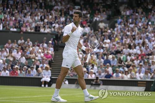 Serbia's Novak Djokovic celebrates defeating Australia's Thanasi Kokkinakis in a singles tennis match on day three of the Wimbledon tennis championships in London, Wednesday, June 29, 2022. (AP Photo/Alastair Grant)