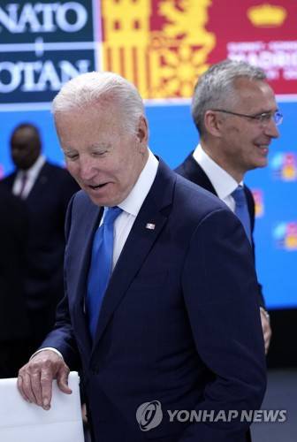 NATO Secretary General Jens Stoltenberg, right, and U.S. President Joe Biden arrive for a round table meeting at a NATO summit in Madrid, Spain on Wednesday, June 29, 2022. North Atlantic Treaty Organization heads of state meet for a NATO summit in Madrid from Tuesday through Thursday. (AP Photo/Bernat Armangue)