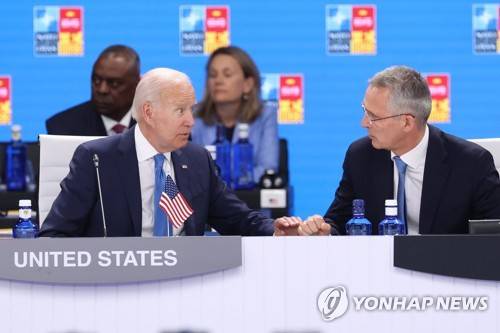 epa10041348 NATO Secretary-General Jens Stoltenberg (R) chats with US President Joe Biden (L) during a meeting on the first day of the NATO Summit at IFEMA Convention Center, in Madrid, Spain, 29 June 2022. Heads of State and Government of NATO's member countries and key partners are gathering in Madrid from 29 to 30 June to discuss security concerns like Russia's invasion of Ukraine and other challenges. Spain is hosting 2022 NATO Summit coinciding with the 40th anniversary of its accession to NATO. EPA/Kiko Huesca