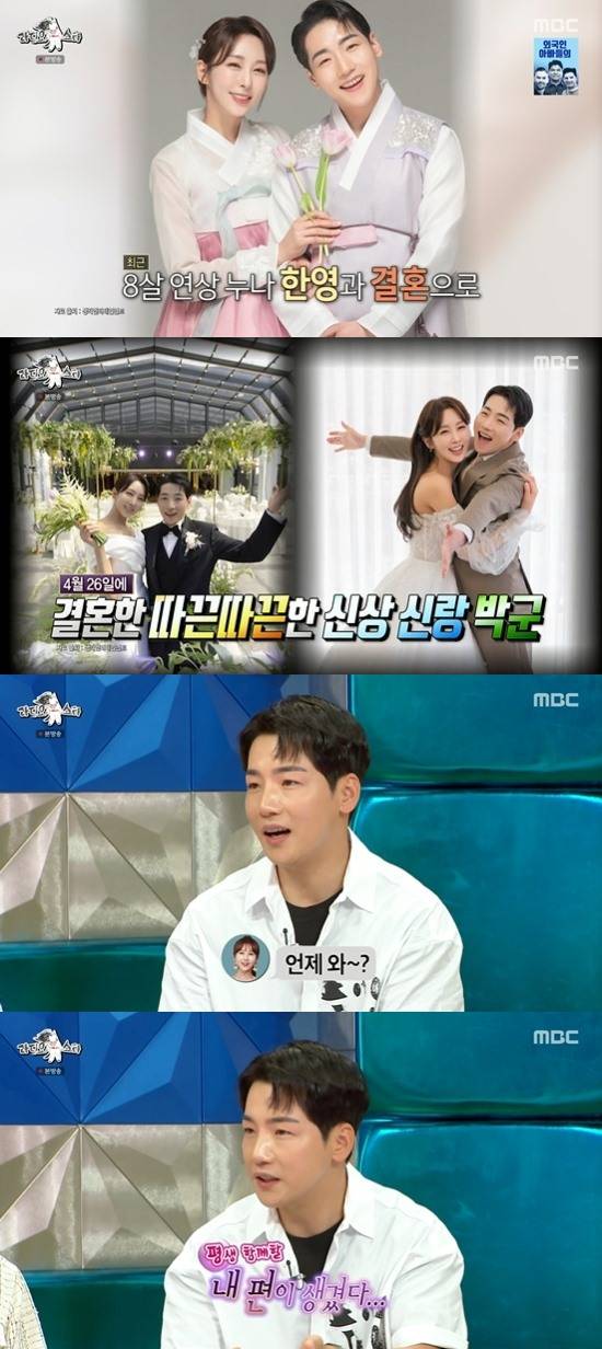 이날 최근 한영과 결혼한 새신랑 박군의 등장에 '라스' MC들은 다시 한 번 축가를 건넸다. 박군은 "집이 따뜻해서 좋다. 내 편이 있다는 것이 좋다"고 했다. 박군은 "저는 제가 결혼을 못할 줄 알았다. (한영이) 제가 원하는 여성상이다. 평강공주 스타일을 좋아한다. '이 여자다' 싶어서 유턴없이 직진을 했다"면서 웃었다.