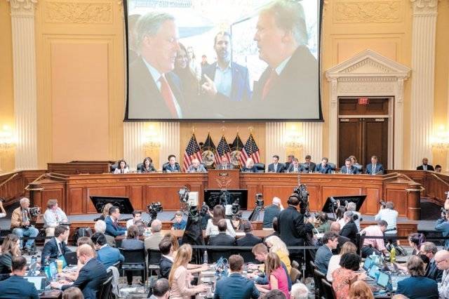 ‘1·6 美의회 폭동’ 청문회 28일 미국 워싱턴 하원에서 ‘1·6 의회 폭동 특별조사위원회’ 청문회가 열리고 있다. 청문회장 정면의 화면에 도널드 트럼프 전 미국 대통령과 그의 측근 마크 메도스 전 백악관 비서실장이 대화하는 사진이 보인다. 워싱턴=AP 뉴시스