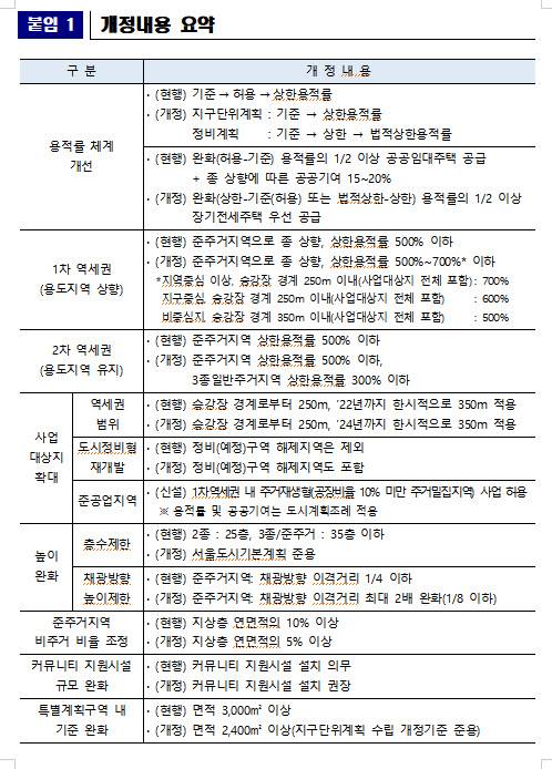 공급 확대를 위한 기준 완화 주요 내용으로는 △준주거지역 용적률 완화 △35층 일률적 층수규제 폐지 △채광창 이격·인동거리 완화 △1차 역세권 범위 완화 기간 연장 △사업대상지 확대 △준주거지역 비주거 비율 완화 등이다. 제도 개선을 위한 개정사항으로는 △용적률 적용체계 개선 △정비(예정)구역 해제지역 재개발사업 방식 허용 △커뮤니티 지원시설 설치기준 개선 △특별계획구역 내 사업부지 최소면적 완화 △전용면적 확대 등이다.