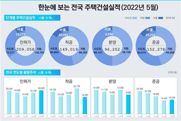 5월 누계 주택 인허가실적은 전국 20만 9058가구로 전년 동기(18만 6743가구) 대비 11.9% 증가했다. 수도권은 7만 3271가구로 전년 동기 대비 22.2% 감소, 지방은 13만 5787가구로 같은 기간 46.6% 증가했다.