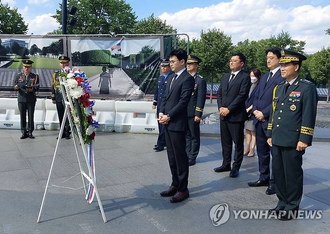 (워싱턴=연합뉴스) 김경희 특파원 = 한동훈 법무부 장관이 29일(현지시간) 한국전쟁 참전 기념비에 헌화하고 있다. 2022.6.30