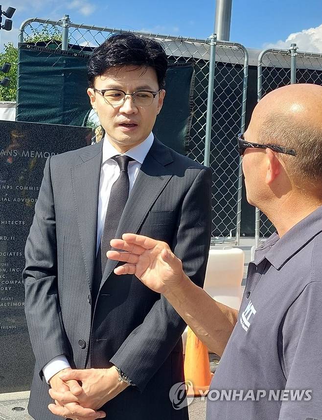 (워싱턴=연합뉴스) 김경희 특파원 = 한동훈 법무부 장관이 29일(현지시간) 한국전쟁 참전 기념비를 찾아 관계자의 설명을 듣고 있다. 2022.6.30