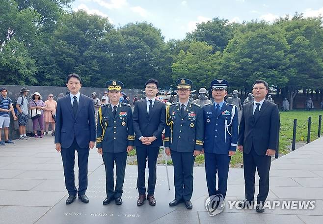 (워싱턴=연합뉴스) 김경희 특파원 = 한동훈 법무부 장관이 29일(현지시간) 한국전쟁 참전 기념비 앞에서 기념촬영을 하고 있다. 2022.6.30