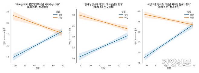20·30대 청년 응답자 답변을 구체적으로 따져보면, 페미니즘 지지에 동의한다는 응답 비율이 남성은 5.5%에 불과했지만 여성은 40.3%에 달해 7배 이상 차이가 났다. 여성 차별이 존재한다는 응답 비율도 남성은 12.4%였지만, 여성은 69.6%로 50%포인트 이상 차이가 났다. 청년층에서 남성과 여성의 젠더이슈에 대한 인식 차이가 매우 크게 나타난 반면, 40·50·60대 응답자군에서는 성별에 따른 페미니즘 인식 차이가 상대적으로 적었다.