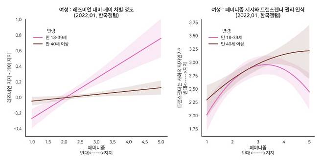 한편 설문조사에서는 페미니즘을 지지하는 청년 여성 응답자군에서 레즈비언을 지지하는 만큼 게이·트랜스젠더를 지지하지는 않는 현상을 포착했다. 페미니즘 지지도에 따라 ‘레즈비언·게이·트랜스젠더는 권리를 보호받아야 할 사회적 약자’라는 문장에 얼마나 공감하는지를 물었다. 전체적으로 청년 여성의 긍정 답변 비율이 청년 남성보다 높았지만, 청년 여성 응답자군 내에서 페미니즘 지지도가 높을수록 레즈비언을 지지하는 정도와 게이·트랜스젠더를 지지하는 정도의 차이가 컸다.