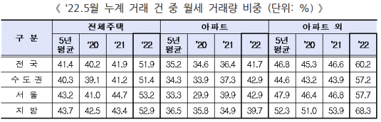 임대차3법 시행 2년을 앞둔 5월 주택 임대차 시장에서 전월세 거래량이 급증하고 특히 월세의 비중이 크게 늘어난 것으로 나타났다. 금리 인상 등의 영향으로 '전세의 월세화' 현상이 가속화되는 데다가, 전월세 신고제 계도기간이 5월 만료되면서 신고가 일시에 몰리면서 나타난 현상으로 파악되고 있다.