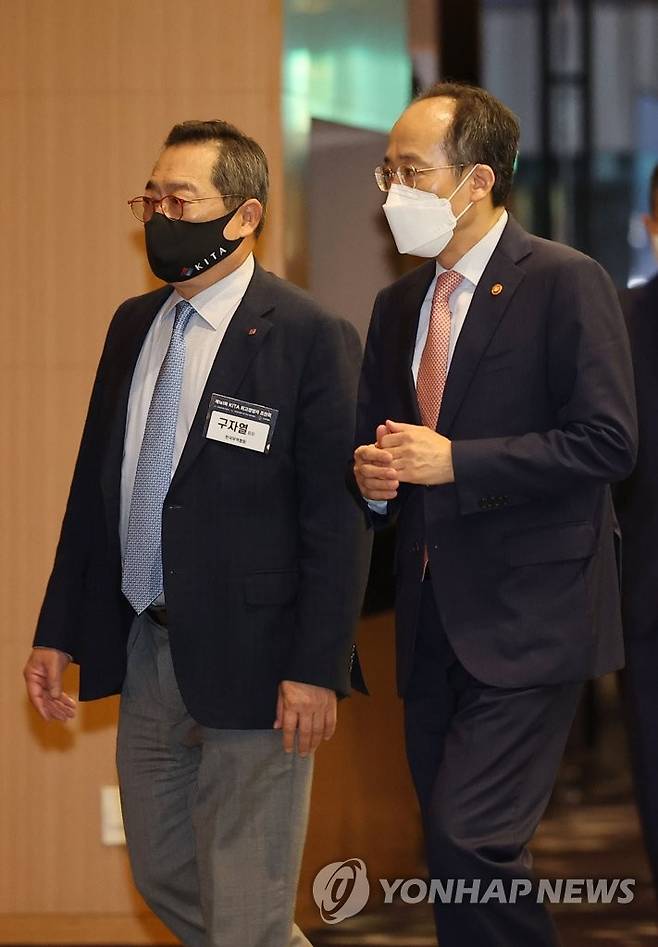 (서울=연합뉴스) 류영석 기자 = 추경호 부총리 겸 기획재정부 장관(오른쪽)과 구자열 한국무역협회장이 30일 오전 서울 강남구 인터컨티넨탈 서울 코엑스에서 열린 제161회 KITA 최고경영자 조찬회에 참석하고 있다. 2022.6.30