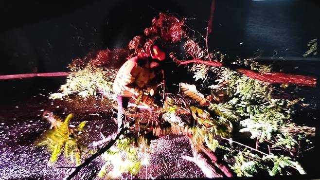 넘어진 나무 자르는 소방관
