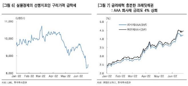 3분기 채권시장 전망에 있어 구리 가격도 주목된다. 실물경제의 선행지표인 구리 가격은 이달 들어서만 11% 떨어지는 등 월간 기준 30년만에 가장 큰 하락세를 보이고 있다. 김기명 연구원은 “3분기 채권시장이 인플레 우려 및 기준금리 인상으로 시장금리가 오르면 경기침체 우려로 시장금리가 하락전환하는 과정을 반복할 수 있다”고 내다봤다. 중앙은행이 공격적으로 금리인상에 나서더라도 경기 침체 우려가 커지면서 채권시장 약세장이 이어질 수 있다는 설명이다.