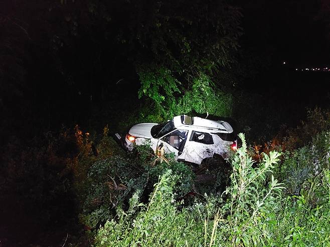 [영월=뉴시스] 김경목 기자 = 30일 오전 강원 영월군 주천면 신일리 82번 지방도에서 소형 SUV 티볼리 차량이 가로수 충격 후 3m 아래로 추락했다. 1명은 심정지, 또 다른 1명은 중상인 상태로 병원에 옮겨졌다. (사진=강원도소방본부 제공) 2022.06.30. photo@newsis.com
