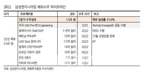 이어 “빠른 시일 내에 7억~8억달러 수준의 말레이시아 쉘 육상가스플랜트(OGP), 10억달러 수준의 베트남 플로체프로필렌/폴리프로필렌(PDH/PP), 1억5000만달러 규모 아랍에미리트 타지즈 암모니아 등의 수주를 기대하고 있으며, 하반기에는 알제리 PDH/PP(14억 달러), 요르단 정유(10억 달러), 인도 모노에틸렌글리콜(MEG)(7억 달러), 카타르 라스라판(15억 달러), 에쓰오일 샤힌(20억 달러) 등의 수주 소식이 대기 중”이라고 강조했다.